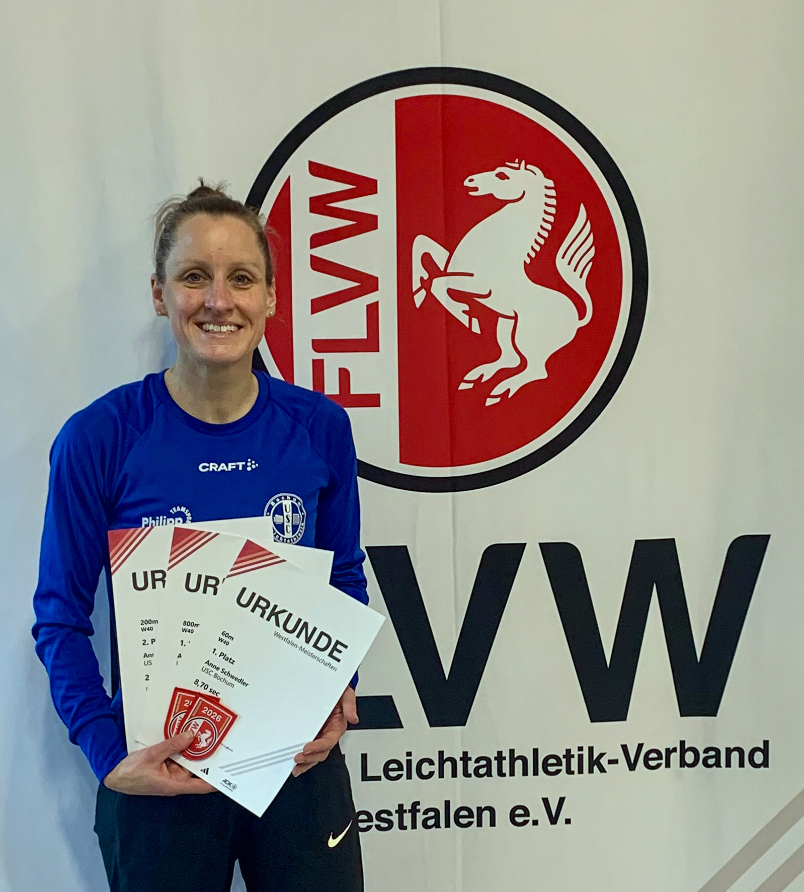Ihren bisher größten Erfolg feierte Anne Schwedler vom USC Bochum mit dem Gewinn einer Gold- und einer Silbermedaille bei den Deutschen Seniorenmeisterschaften in Leinefelde-Worbis. Die frühere Stabhochspringerin, 2003 Westfälische Jugendmeisterin in dieser Disziplin, hatte eine langjährige Betreuung von Schülergruppen im Verein für ein professionelles Training aufgegeben, um sich für die Teilnahme an Deutschen Meisterschaften zu qualifizieren. Dabei hatte sie eine besondere Veranlagung für den Langsprint entdeckt. Ihre hervorragende Hürdentechnik ließ sich besonders gut in den 400-m-Hürdenlauf einarbeiten. Um der Gymnasiallehrerin eine Qualifikationsmöglichkeit für diese selten gelaufene Strecke zu ermöglichen, hatte der USC diesen Lauf an seinem Werfer- und Läufertag in sein Programm aufgenommen, bei dem sie die Norm deutlich unterbot. Mit drei Laufdisziplinen hatte die Bochumerin sich ein umfangreiches Programm für die DM aufgebürdet, 400-m-Hürden am Morgen, 400 m flach am frühen Nachmittag und 200 m am folgenden Tag. Angesichts der kalten und ungünstigen Windbedingungen war die Läuferin nicht nur mit den Platzierungen sehr zufrieden, sondern auch mit den vergleichsweise hervorragenden Zeiten. Im 400-m-Hürdenlauf siegte Anne Schwedler mit 69,48 Sekunden, über 400 m wurde sie Zweite in 64,55 Sekunden. 28,53 Sekunden über 200 m ergaben Platz sieben. “Im 400-m-Hürdenlauf konnte Anne wegen ihrer hervorragenden Technik noch etwas Kraft für den nachmittags anstehenden 400-m-Lauf sparen. Dort war aufgrund der Meldeleistungen ein harter Kampf um Platz zwei zu erwarten. Daher wählte sie eine andere Taktik und ist etwas vorsichtiger angelaufen. Dafür konnte sie aber mit einem starken Finish die anderen Mitkonkurrentinnen im Kampf um Silber deutlich auf Distanz halten. Der langfristige Trainingsaufbau hat offensichtlich gut funktioniert, da Anne zum Saisonhöhepunkt topfit war”, lautete das Fazit ihres Vaters und Trainers Wolfgang.