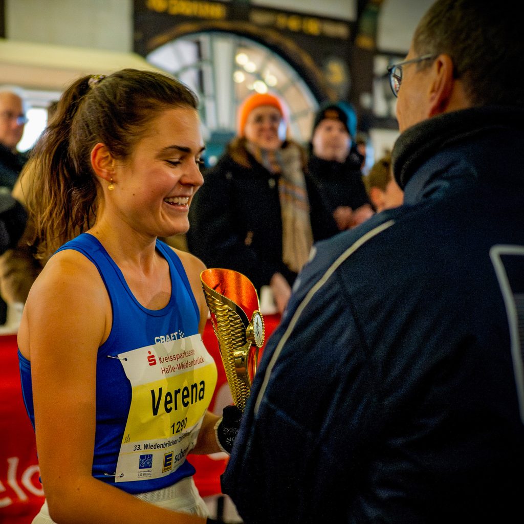 Nach wesentlichen Leistungssteigerungen in den letzten Monaten war der Sieg Verena Vorspohls beim Christkindlauf in Wiedenbrück, wie sie sagt, „krönender Abschluss“ einer erfolgreichen Saison. 1301 Läuferinnen und Läufer gingen an den Start und absolvierten fünf Runden um den Christkindmarkt durch die romantische und weihnachtlich beleuchtete Altstadt. Viele Zuschauer sorgten für gute Stimmung und Motivation auf der Strecke, von der auch die Bochumerin erfasst wurde. So fiel es ihr auch leicht, mit einem deutlichen Vorsprung von 1:28 Minuten vor der Zweiten nach 10250 m durchs Ziel zu laufen.